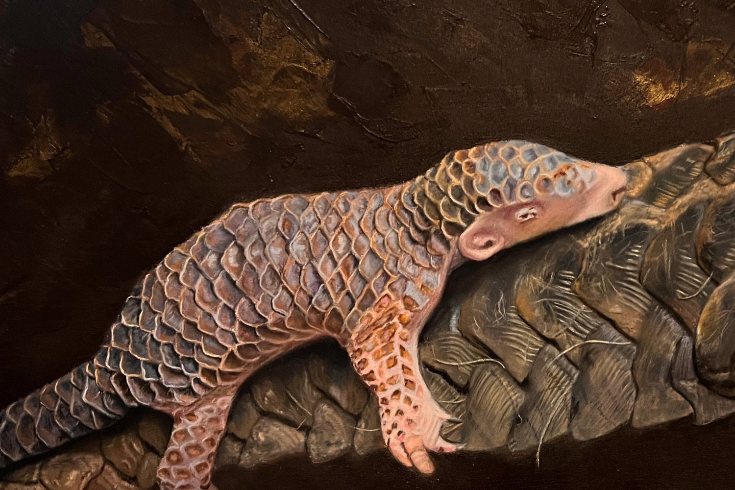 A Pangolin Pup born with soft scales, clings to it's mum's armoured tail. When threatened the Pangolin will curl up into a ball protecting her pup surrounded by her tough scales.