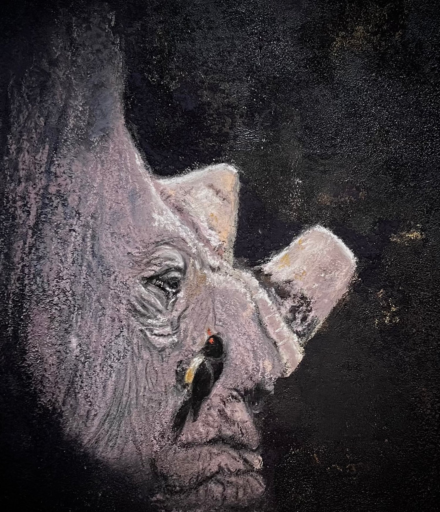 A moment captured between a loan rhino and a little oxpecker. I felt in this image, that the oxpecker was looking deep into the rhinos soul. An understanding between them, a quiet moment reflecting on the loss of his horn.