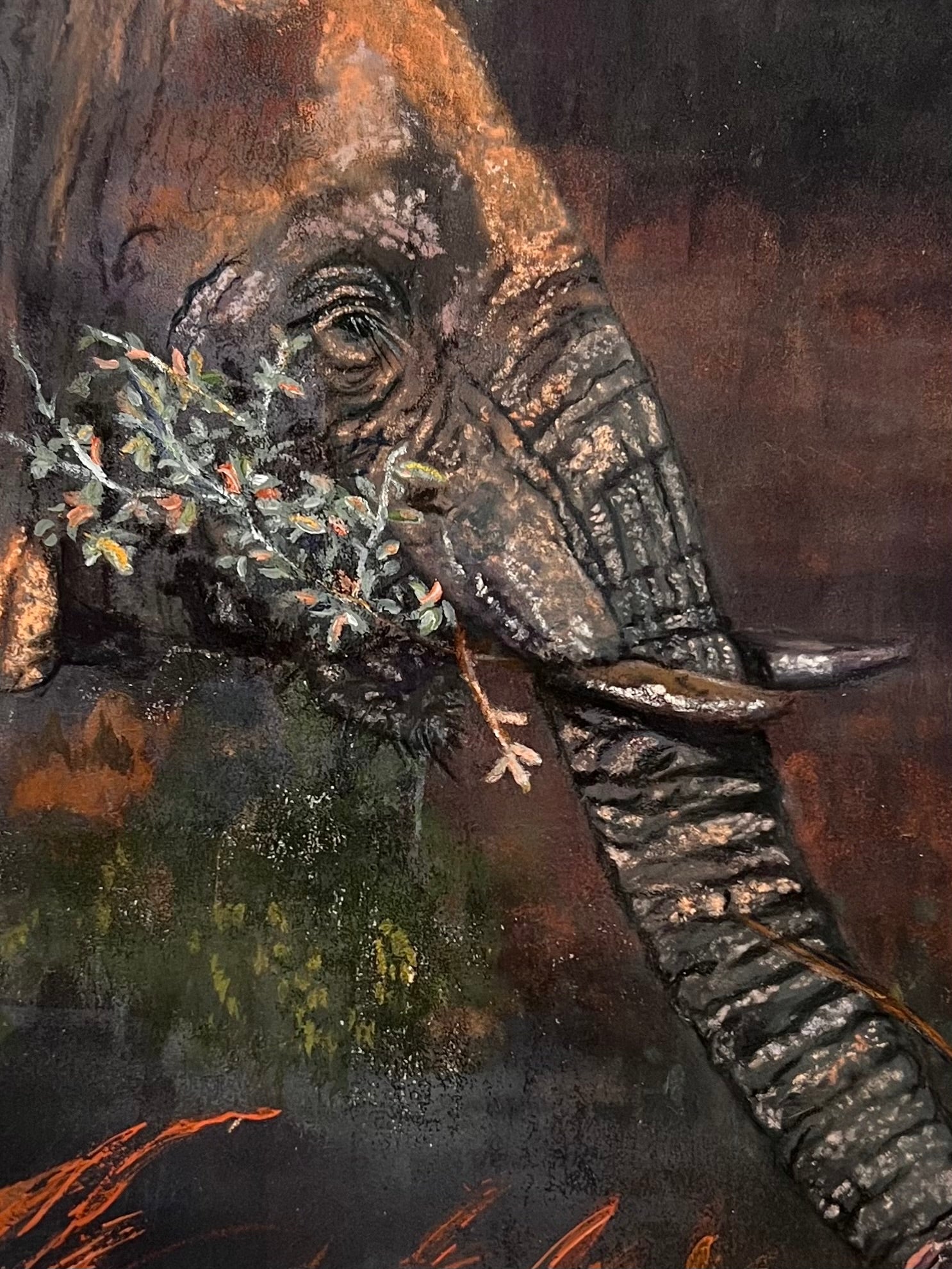 A moment captured in the Kwai concessions, Botswana. Whilst in camp, taking in the natural beauty of the wilderness, an elephant appeared behind the trees a few metres away from where I sat quietly. As he began eating the leaves from the Acacia tree, we shared a glance and I captured this moment behind the lens, turning the memory into a piece of art.