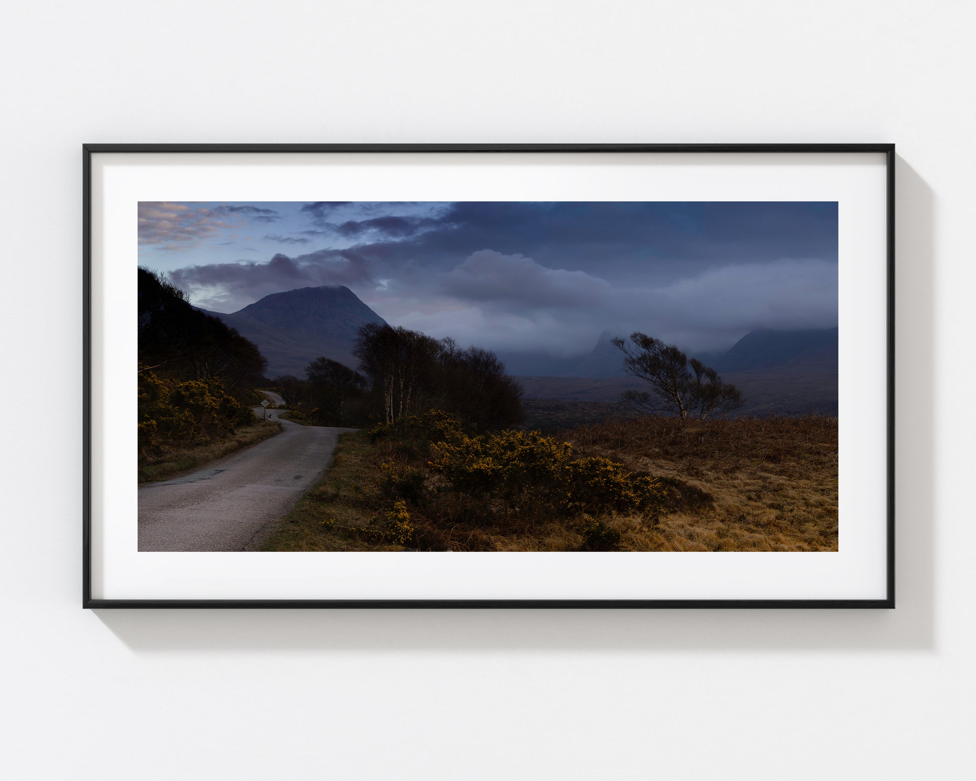'A Road Less Travelled' Fine art photography capturing a mysterious Scottish Loch side road stretching out towards the mountains. The dusk mist shrouded moorlands unfold beside the the lonely road, hiding its secrets in quiet mystery. A beautiful limited edition landscape print by artist Meral Altilar.