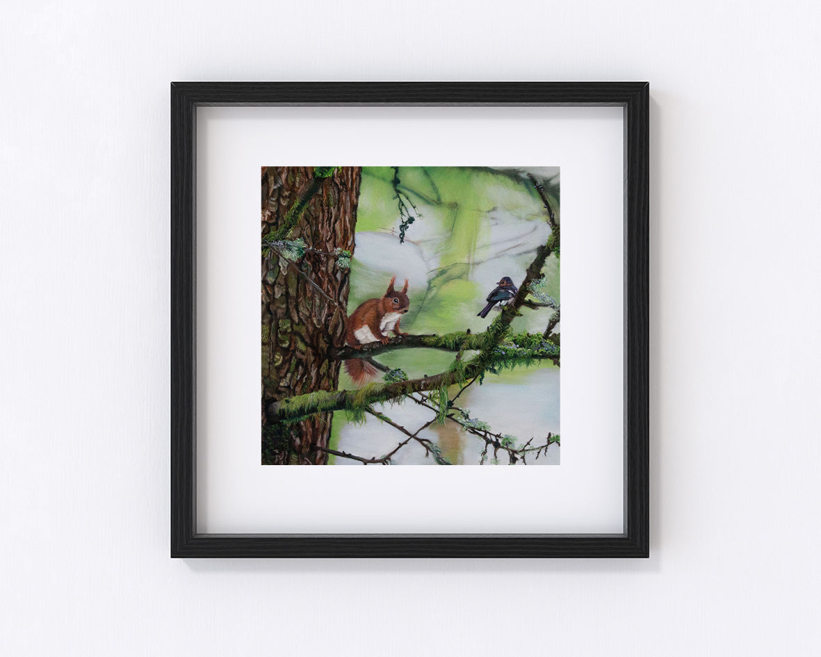 A soft pastel painting inspired by the beautiful Lake District Red Squirrels. This playful squirrel found himself sharing a moments exchange with a small bird.