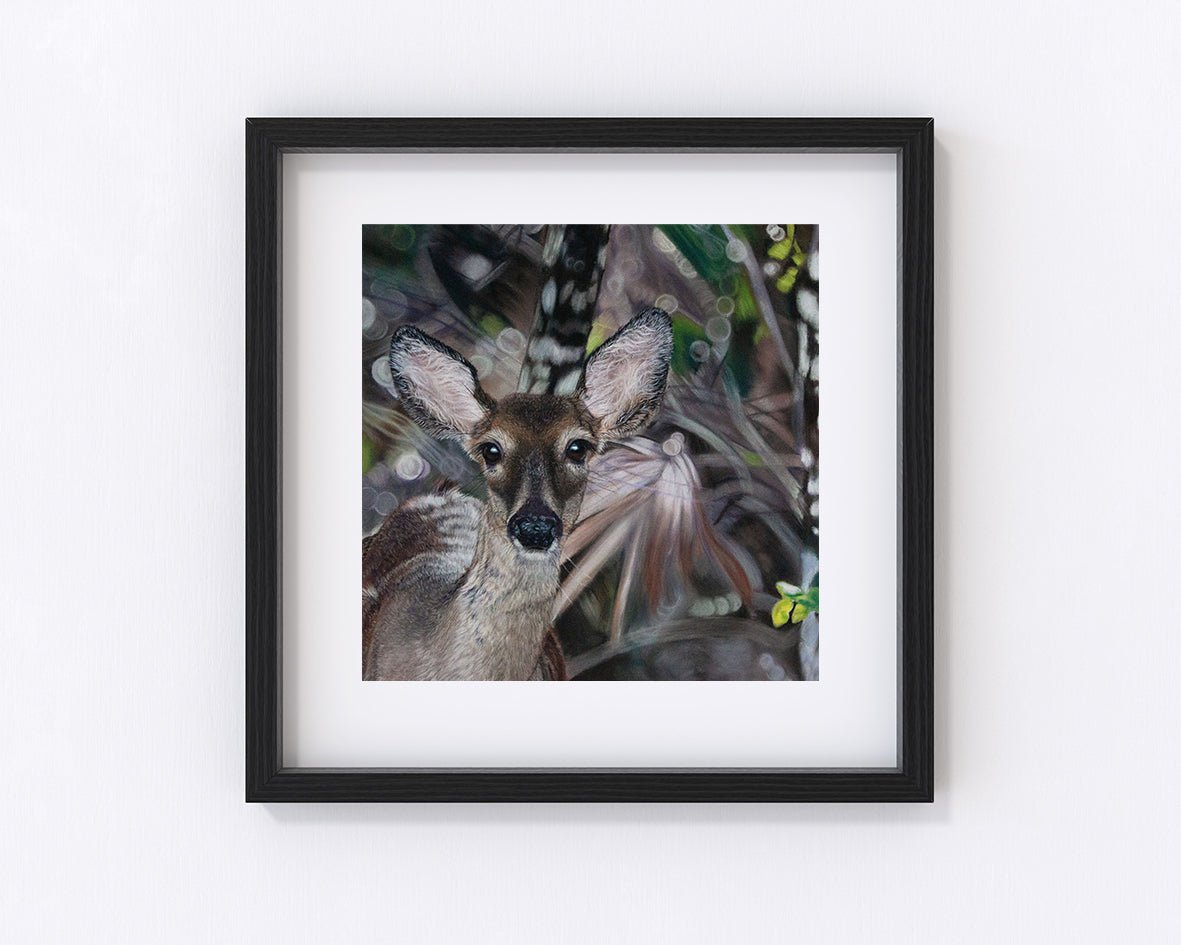 A soft pastel painting, depicting a shared gaze between the artist and a white tailed deer at a Florida state park