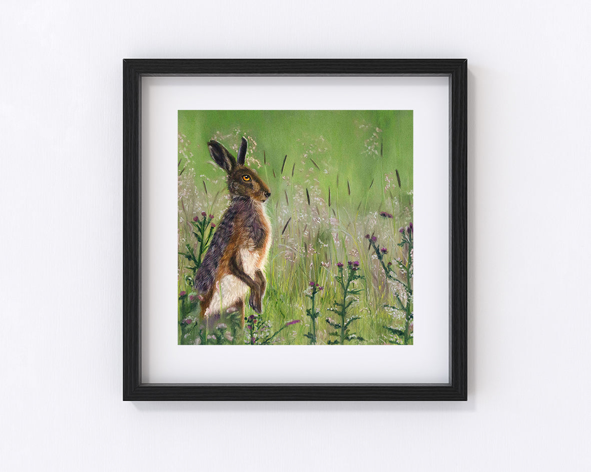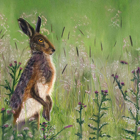 A soft pastel painting capturing the moment a hare stepped out of the long grassland in the Yorkshire Dales. The hare surveys his environment for predators, as he steps out into the fading sunshine.