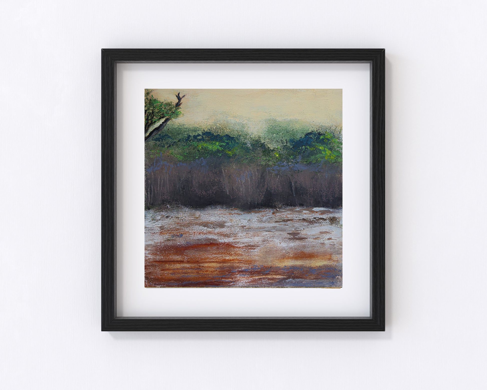 A monotype print in acrylic and pastel. Wildlife retreats into the shadows, just out of sight, watching quietly. Layers of texture and rich earthy tones depict the dense bushveld lining the sides of a track whilst over-landing in Botswana.